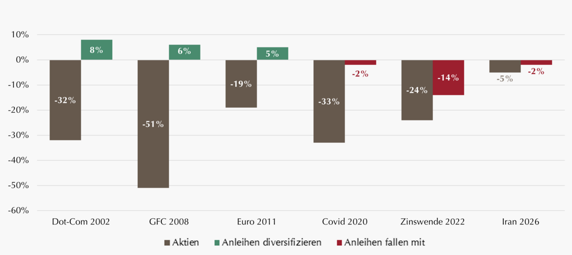 Quelle: Lupus alpha, Bloomberg. Indices: MSCI World 100% Hedged to EUR und Bloomberg Global Agg Hdg EUR; Krisenzeitraum: Peak-to-Trough MSCI World zwischen 2002 und 2026. Wertentwicklungen in der Vergangenheit sind keine Garantie für die zukünftige Wertentwicklung. Für Marketing- und Informationszwecke – nur für professionelle Investoren.