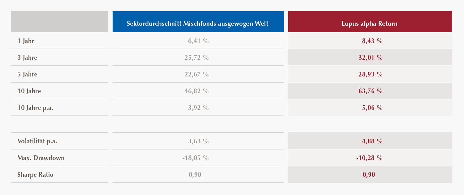 Wertentwicklung des Lupus alpha Return im Vergleich mit ausgewogenen Mischfonds