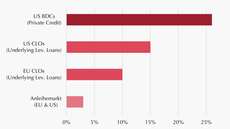 Besonders deutliche Stresssymptome zeigten sich im BDC-Segment in den USA, da hier in den vergangenen Jahren verstärkt Kapital von (vermögenden) Privatpersonen (High Net Worth Individuals) eingeworben wurde – also einer Anlegergruppe, die in Stressphasen deutlich schneller Liquidität nachfragt als institutionelle Investoren mit langen Anlagehorizonten.
