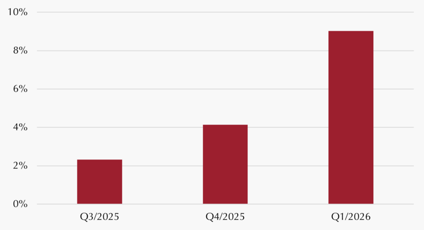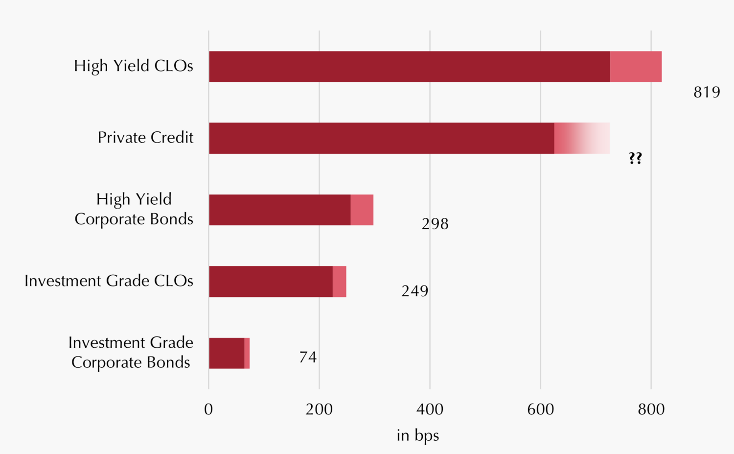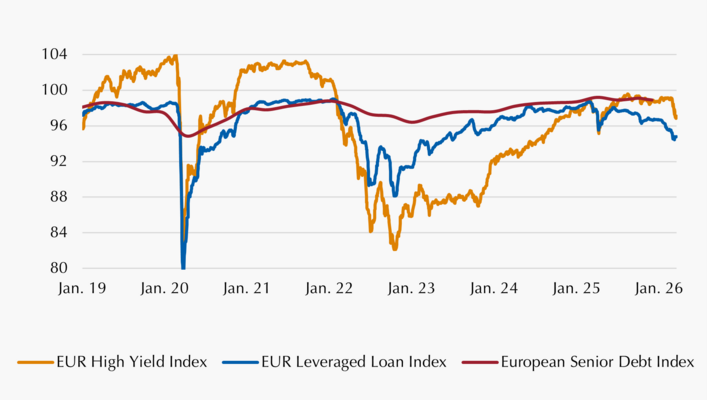 Seit der Zinswende 2022 profitiert die Assetklasse (wie auch CLOs) stark von der Rückkehr der Zinsen: Der wieder strukturell positive Euribor (Basiszins der Kredite) wirkt den sinkenden Credit Spreads (Risikoaufschläge) des Private Debt-Segments entgegen. Letztere sind von 800-900 Basispunkten (bps) vor der Zinswende auf etwas über 600 bps per Jahresende 2025 gefallen. Im Zuge der aktuellen Verwerfungen dürften sich die Spreads zwar wieder etwas ausgeweitet haben, allerdings liegen aufgrund der mangelnden Transparenz dieser Assetklasse keine belastbaren Zahlen vor.
