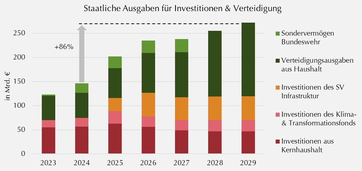 Die Aspekte, die im zweiten Halbjahr des vergangenen Jahres auf den Kursen der deutschen Aktienmärkte lasteten, werden aller Voraussicht nach im kommenden Jahr in den Hintergrund treten. Dies stimmt uns positiv, dass die begonnene Erholung des Segments im Jahr 2026 erneut Fahrt aufnimmt. Die Börsenreaktion im ersten Halbjahr 2025 hat bereits das Potenzial der Fiskalpakete deutlich gemacht, allerdings ist der weitaus größte Teil der geplanten Mittel noch nicht in der Realwirtschaft angekommen. Sowohl bei der Auftragsvergabe als auch bei den tatsächlichen Auszahlungen der Mittel steht der Großteil erst bevor (siehe auch Grafik). Selbst Teile des Budgets für 2025 dürften noch nicht verplant bzw. ausgezahlt sein.