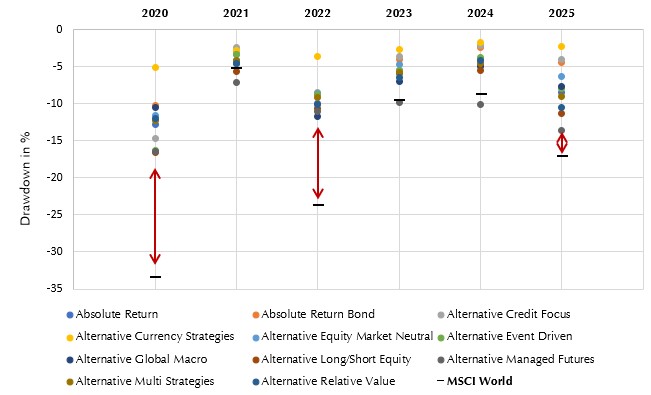 Liberation Days im ersten Halbjahr einen Rücksetzer von –17,06%. Mit wenigen Ausnahmen gelang es allen Strategien, ihre durchschnittlichen Maximalverluste deutlich über diesem Niveau zu halten. Die geringsten durchschnittlichen Drawdowns weisen Absolute Return Bond (−5,50%), Alternative Credit Focus (−5,68%) und Alternative Currency Strategies (−5,94%) auf. Alle Strategien haben jedoch größere Maximalverluste als Euro-Unternehmens- und Euro-Staatsanleihen (−2,32%).