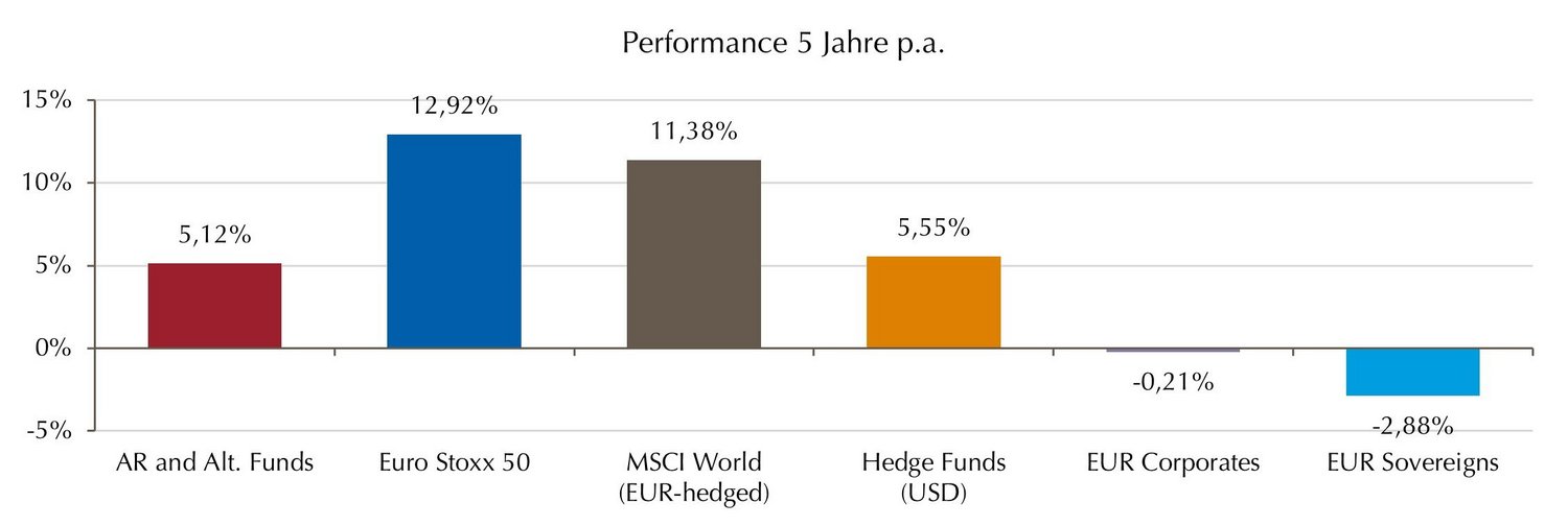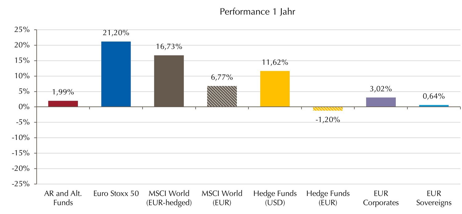 Trotz des Aufwärtstrends im zweiten Halbjahr blieb die Assetklasse deutlich hinter den Aktienmärkten zurück. Europäische Aktien verzeichneten im Jahresverlauf eine Performance von 21,20%, globale Aktien (EUR‑hedged) legten 16,73% zu. Auf der Rentenseite erwirtschafteten Euro-Unternehmensanleihen eine Rendite von 3,02%, europäische Staatsanleihen lagen leicht positiv bei 0,64%. Unregulierte Hedgefonds in US‑Dollar erreichten hingegen eine Performance von 11,62% und schnitten damit deutlich besser ab als die Pendants im UCITS‑Mantel sowie klar besser als europäische Renten.