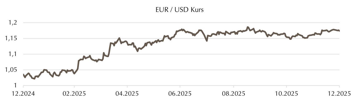 Anleger außerhalb der USA mussten 2025 erfahren, wie stark Währungsbewegungen die Performance internationaler Investments beeinflussen können. Eskalierende Handelskonflikte, zunehmende Staatsverschuldung, Diskussionen über die geldpolitische Unabhängigkeit der US‑Notenbank sowie geopolitische Unsicherheit führten zu einem massiven Vertrauensverlust in den US‑Dollar. Gemessen am US‑Dollar‑Index (DXY), der die Stärke des US‑Dollars gegenüber einem Korb wichtiger Weltwährungen abbildet, verlor der USD im Jahresverlauf 9,4% an Wert. Der Euro wertete sogar um 13,4% gegenüber dem US-Dollar auf.