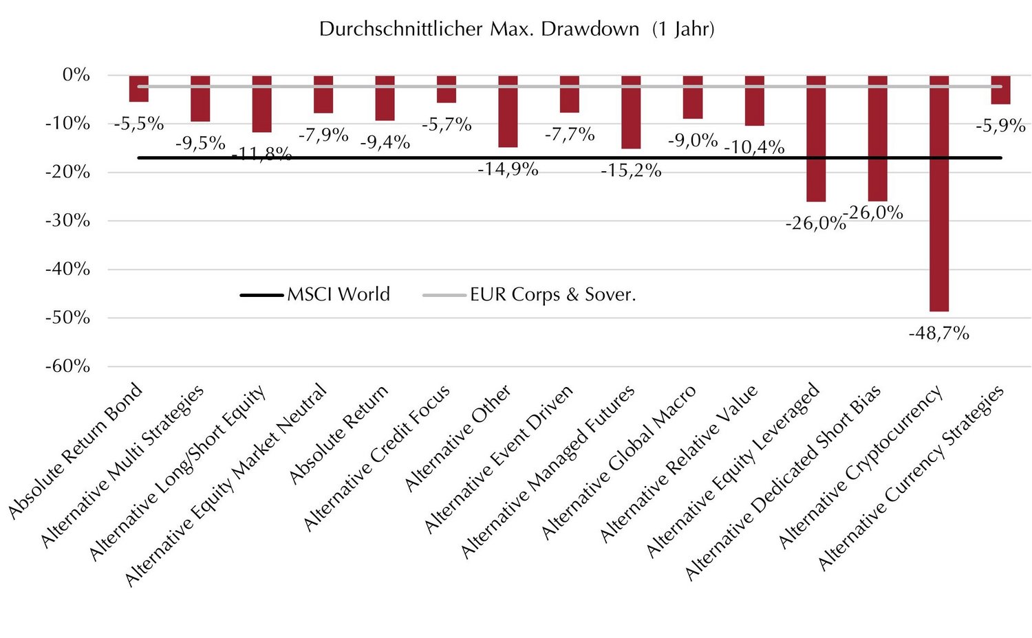 Die meisten Liquid‑Alternatives‑Strategien konnten ihre maximalen Verluste deutlich unterhalb eines Aktieninvestments halten. Der MSCI World (EUR‑hedged) verzeichnete im Zuge des sogenannten