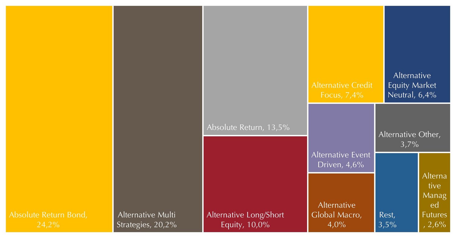 (+2,8%), Alternative Multi Strategies mit 20,2% sowie Absolute Return mit 13,5%. Die beiden Fixed‑Income‑Strategien – Absolute Return Bond und Alternative Credit Focus – vereinen gemeinsam 31,6% des gesamten Marktvolumens auf sich. Dieser seit Jahren stabile Trend unterstreicht die anhaltend hohe Bedeutung defensiver Rentenstrategien im Liquid‑Alternatives‑Universum.