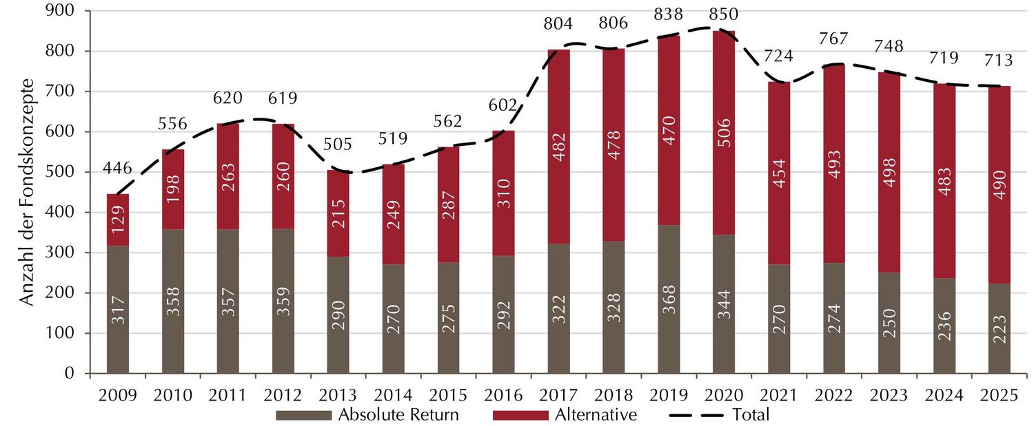 Die Gesamtzahl der Fonds im Segment blieb auf Jahressicht nahezu konstant: Mit 713 Fonds liegt das Universum nur leicht unter dem Vorjahreswert von 719 Fonds. Dennoch kam es im Jahresverlauf zu merklichen Bewegungen innerhalb des Universums: Insgesamt wurden 66 neue Fonds aufgelegt, während verschiedene Fonds, z.B. aufgrund fehlender deutscher Vertriebszulassung oder strategischer Anpassungen aus dem Datensatz ausgeschieden sind. Die größten Anteile an den Neulancierungen entfielen auf die Strategien Alternative Long/Short Equity sowie Alternative Multi Strategies, die jeweils zehn neue Fonds beisteuerten. Unter dem Strich stieg die Zahl der Alternatives-Fonds leicht von 483 auf 490. Die Zahl der Absolute-Return-Konzepte hingegen sank um 5,5% auf 223 Fonds. Das Verhältnis zwischen beiden Strategiegruppen blieb weitgehend unverändert: Rund zwei Drittel der Fonds entfallen auf Alternatives, etwa ein Drittel auf Absolute Return