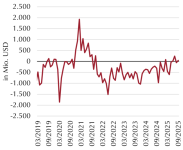 Weltweite Nettomittelflüsse (12 Monate rollierend) in Wandelanleihe-Fonds im Zeitraum März 2019 bis September 2025. Quelle: Bank of America, eigene Darstellung. Stand: Oktober 2025.
